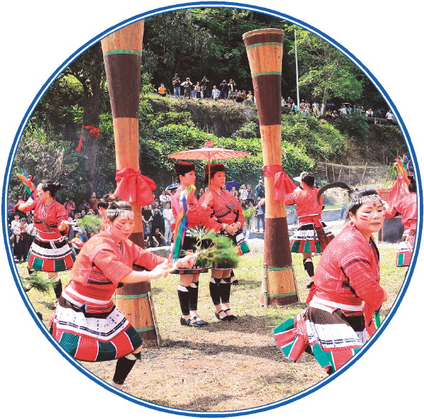 歌舞场上,来自周边各村寨的巡游队伍吹着唢呐、踏着欢步,沿青石板路穿寨而行,走过古色古香的风雨桥,一路欢歌走向月亮岛。潘氏宗祠内,红瑶少女成年礼庄重举行,剪下的长发被悉心珍藏,承载着族人祝福,是民族文化代代相传的鲜活见证。