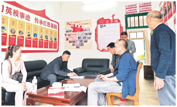 ▲陈卫刚(左二)在给纠纷双方书写调解过程笔录。