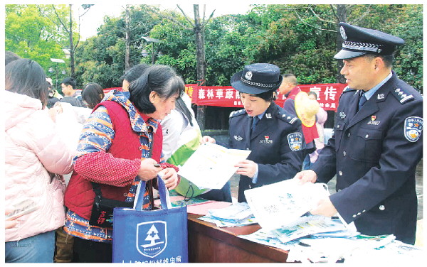 ▲3月23日,在爱鸟周主题宣传活动中,桂林市公安局生态环境保护分局民警向群众宣传保护鸟类等生态环境保护知识。 马尔娜 摄