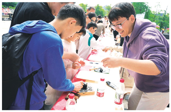 当天,本届阅读大集的“线索人物”——文学大家“颜延之”与友人在图书馆广场上读书、奏乐、游览,吸引来往读者跟上步伐,亦如千年前一样,在桂林又一次掀起读书热潮。广场两边,由高校图书馆、县(市、区)公共图书馆打造的联动展区,凭借各项传统技艺体验活动受到读者的欢迎,读者们亲手刷墨、铺纸、拓印,将颜延之“峨峨郛邑间”诗句印在宣纸上;在“学海无涯”瓦当拓印区里,孩子们专注地敲打拓包,感受古人勤学苦读的精神;石刻书法临摹区前,不少读者提笔描摹“宋颜公读书岩”石刻字样,与先贤展开跨越时空的对话。