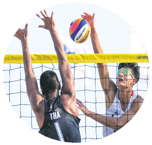 4月26日,在海南三亚举行的第六届亚洲沙滩运动会沙滩排球男子16强淘汰赛中,中国组合张泰/周朝威2比1战胜泰国组合班鲁·纳巴空/波拉维·陶瓦托。图为张泰(右)在比赛中扣杀。