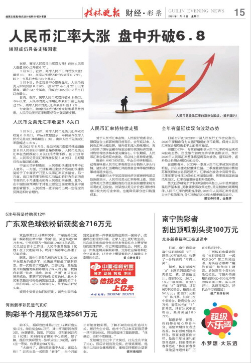 1月9日,外汇交易中心数据显示,人民币兑美元中间价报6.8265,创2022年8月22日以来最高,调升647个基点,升幅为2022年12月2日以来最大。