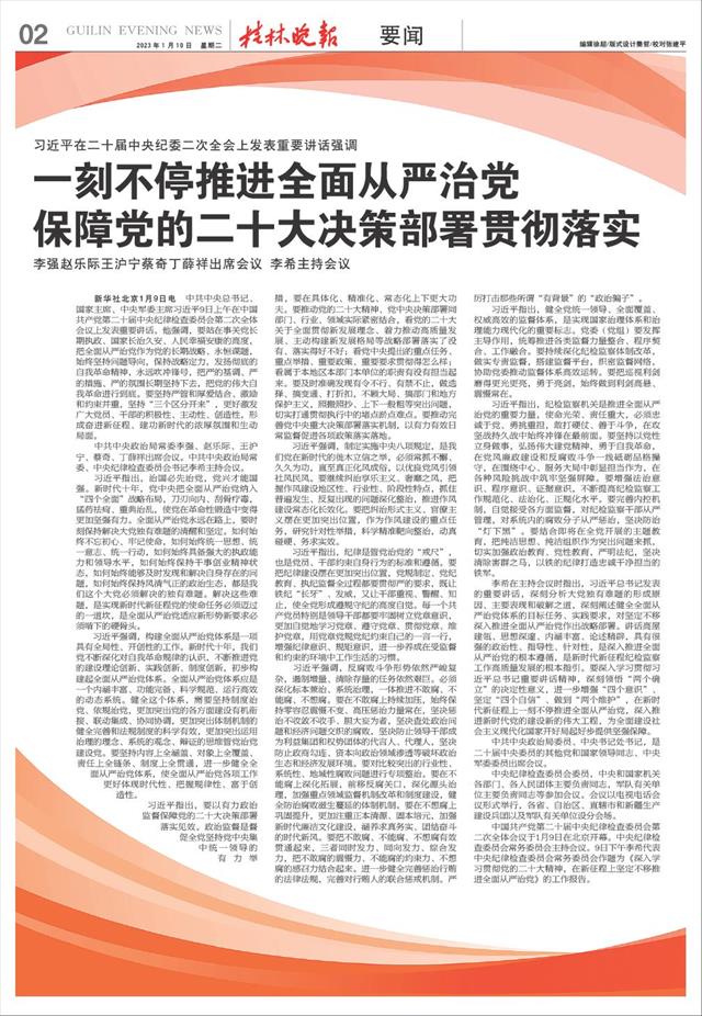 中国共产党第二十届中央纪律检查委员会第二次全体会议于1月9日在北京开幕。中央纪律检查委员会常务委员会主持会议。9日下午李希代表中央纪律检查委员会常务委员会作题为《深入学习贯彻党的二十大精神,在新征程上坚定不移推进全面从严治党》的工作报告。