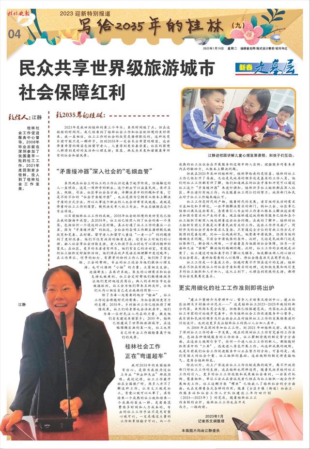以目前桂林社工工作的成就,2035年社会软环境的美好变化已经在我的脑海中成型。在2035年,社工站已经深入到了社会的每一个角落,包括任何一个边远的山区村镇,真正打通了社工工作的最后一公里。因为“矛盾缓冲器”的抵达,全社会的各项工作都在潜移默化被改变和完善。在村镇,留守老人和留守儿童这“一老一小”的问题得到了更好改善,他们不仅有政府的物质支持,还有社工对他们的心理、融入社会等社会功能支持,老人和孩子在山村也可以得到精神的富足;在社区,更多的长者老有所乐,他们有自己的活动室,有固定的社工组织定时组织活动,他们将在欢声笑语互相理解中度过晚年;在工作单位,怀孕的妇女、有薪资纠纷的工作人员,他们除了有妇联、工会的帮助,专业的社工还会为他们提供心理支持,也可以借助“小组”的力量,大家相互支持,迎接新生;在医疗系统,医生的心理需求和社会支持也被看到,社工会定时帮他们做情绪疏导让他们更好地适应岗位;病人的求助信号也会被接收到,社工会为他们带来互助关怀,让他们从内心相信自己走出疾病的阴影……