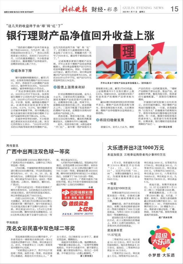 “我的银行理财产品半月前本金赔了将近14000元,今天点开一看,已经涨回来6000多元了。”来自山东的投资者小刘表示。在经历了2022年11月、12月的震荡调整后,不少投资者日前表示,随着理财产品净值回升,近期浮动收益上涨了不少。