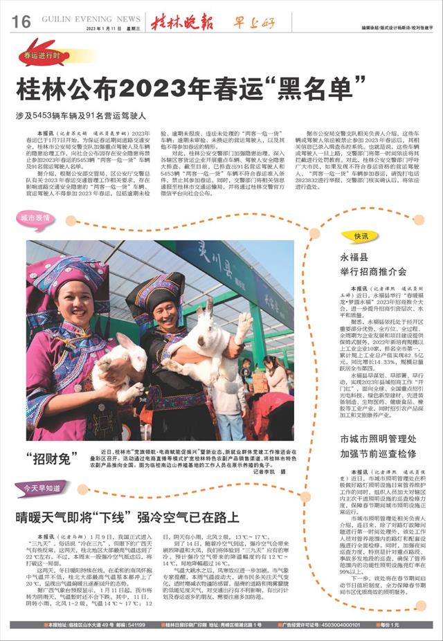 本报讯(记者苏文娟 通讯员聂梦娴)2023年春运已于1月7日开始。为保证春运期间道路交通安全,桂林市公安局交警支队加强重点驾驶人及车辆的隐患治理工作,向社会公布因存在安全隐患将禁止参加2023年春运的5453辆“两客一危一货”车辆及91名营运驾驶人名单。