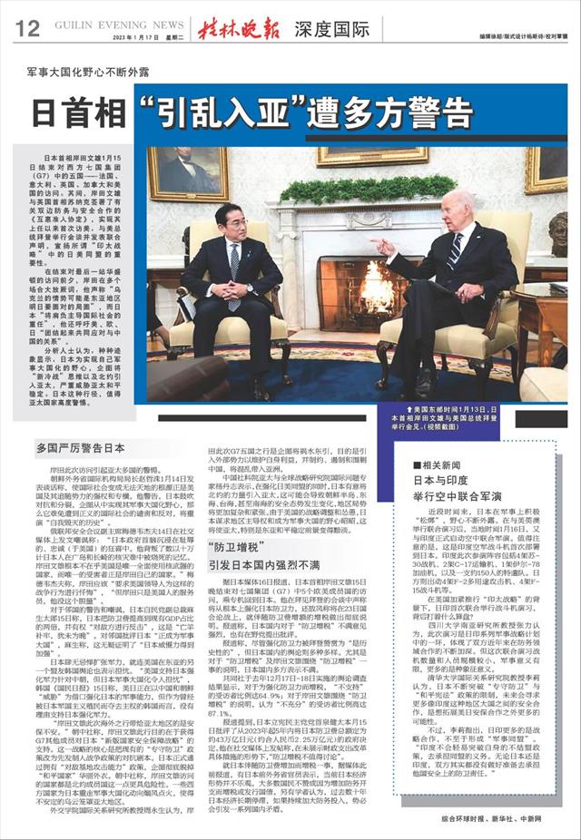 近段时间来,日本在军事上积极“松绑”,野心不断外露。在与美英澳举行联合演习后,当地时间1月16日,又与印度正式启动空中联合军演。值得注意的是,这是印度空军战斗机首次部署到日本。印度此次参演阵容包括4架苏-30战机、2架C-17运输机、1架伊尔-78加油机,以及一支约150人的特遣队。日方则出动4架F-2多用途攻击机、4架F-15战斗机等。
