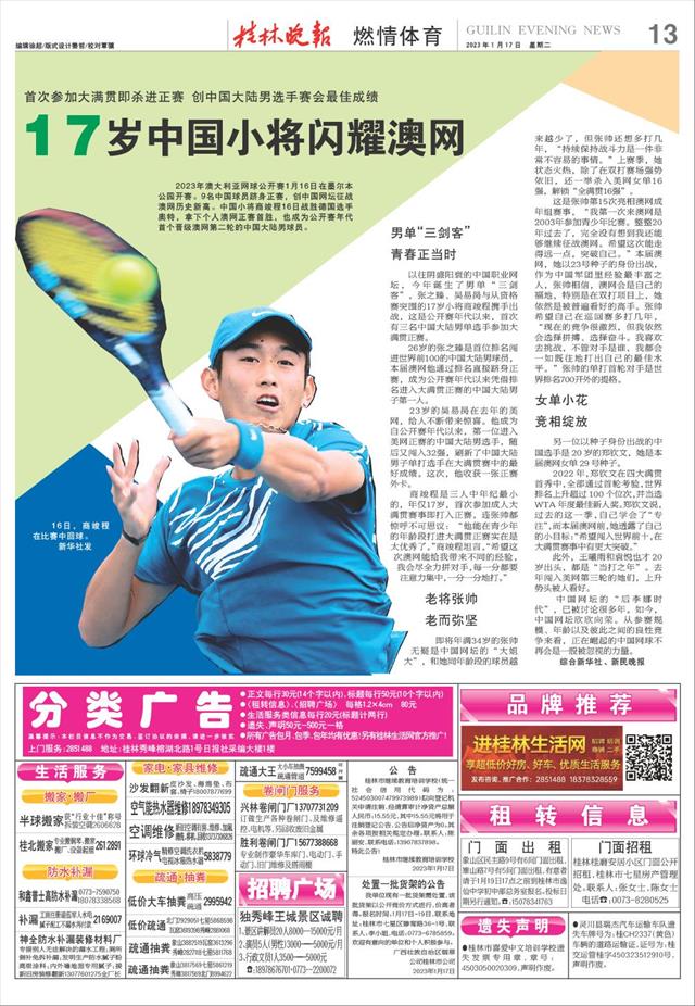 17岁中国小将闪耀澳网   2023年澳大利亚网球公开赛1月16日在墨尔本公园开赛。9名中国球员跻身正赛,创中国网坛征战澳网历史新高。中国小将商竣程16日战胜德国选手奥特,拿下个人澳网正赛首胜,也成为公开赛年代首个晋级澳网第二轮的中国大陆男球员。