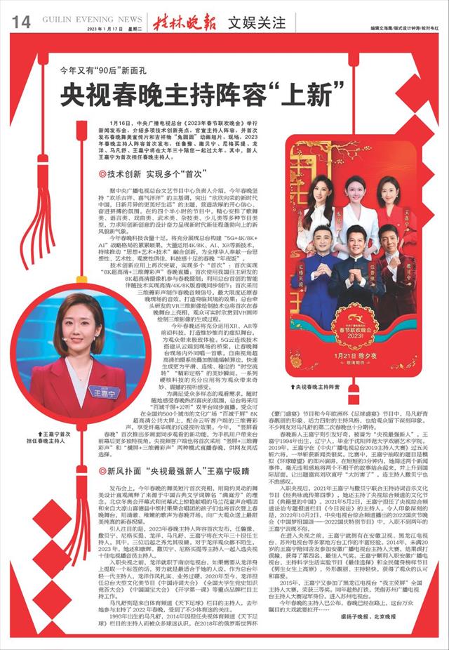 央视春晚主持阵容“上新”   1月16日,中央广播电视总台《2023年春节联欢晚会》举行新闻发布会,介绍多项技术创新亮点,官宣主持人阵容,并首次发布春晚舞美宣传片和吉祥物“兔圆圆”动画短片。现场,2023年春晚主持人阵容首次发布,任鲁豫、撒贝宁、尼格买提、龙洋、马凡舒、王嘉宁将在大年三十陪您一起过大年。其中,新人王嘉宁为首次担任春晚主持人。