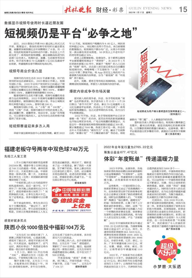 体彩“年度账单” 传递温暖力量   2023年伊始,全国各级、各地体育彩票机构纷纷晒出体彩销售额和公益金筹集额的“年度账单”。这些“年度账单”,传递着体彩公益的温暖力量,点亮着体彩市场的复苏之光。