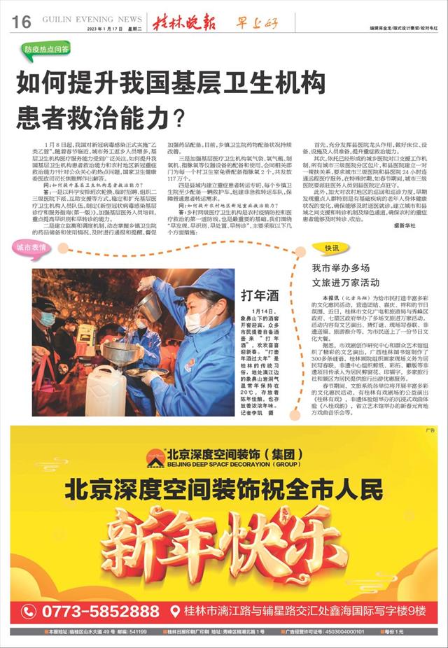 据悉,市戏剧创作研究中心和群众艺术馆组织了精彩的文艺演出,广西桂林图书馆制作了300多条谜语,桂林画院组织画家现场义务为居民写春联,非遗中心组织剪纸、彩拓、雕版等非遗项目传承人为居民剪窗花、印福字,多家旅行社和景区为居民提供旅行出游优惠服务。