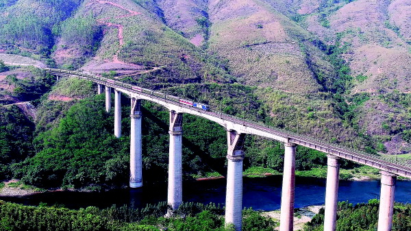 1月16日,一列绿皮火车经过八渡南盘江铁路桥开往册亨站(无人机照片)。