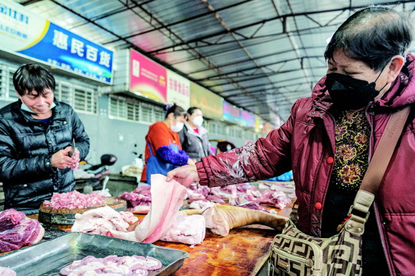 黄荣秀在菜市里挑选制作玻璃扣的肥肉。