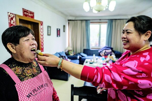 黄荣秀的女儿喂她吃玻璃扣,一家人开开心心过大年。