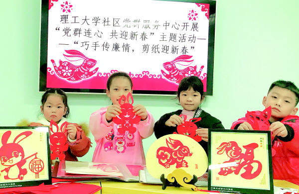 18日,七星区理工大学社区活动室内,剪纸非遗传承人带着社区的小朋友一起动手剪纸,喜迎新春佳节。在老师的指导下,一张张红纸在小朋友的手中变成了活泼可爱的兔子状窗花,大家开心不已。记者李凯 摄