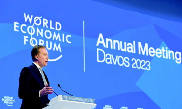 20日,世界经济论坛总裁博尔格·布伦德在世界经济论坛2023年年会作闭幕致辞。