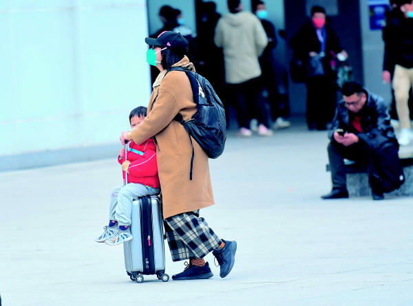 前几天,在桂林站站前广场,一位旅客把小孩放在行李箱上,跟行李一起推行前往车站。记者滕嘉 摄