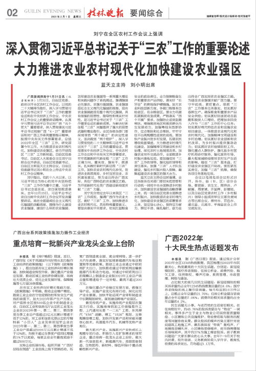 刘宁充分肯定去年以来我区“三农”工作成效,强调广西作为农业大区,做好“三农”工作、加快推进农业农村现代化,具有特殊重要意义。要坚决落实中央要求,切实扛起粮食安全的政治责任,全力保障粮食生产和重要农产品供给,落实好“长牙齿”的耕地保护硬措施,加大农业科技创新力度,争做口粮基本自给省区、有余粮省区。要全力巩固拓展脱贫攻坚成果,严格落实“四个不摘”要求,加强防止返贫监测帮扶,增强脱贫地区和脱贫群众内生发展动力,加强粤桂东西部协作、定点帮扶和社会帮扶,牢牢守住不出现规模性返贫的底线。要加快产业振兴促乡村发展,拓展农民增收致富渠道,大力推进农村现代化建设,加强精神文明建设和乡村治理,深化农村土地制度改革,加强农业对外交流合作,全面推进乡村振兴落地见效。要加强党对“三农”工作的领导,强化组织领导和责任落实,加强“三农”人才队伍建设,强化乡村振兴投入保障,凝聚起建设农业强区的强大合力。