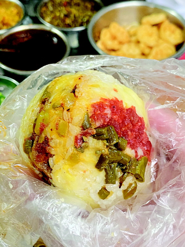 在桂林,各家糯米饭的配料有所不同,“蒋记王城糯米饭”的配料十分丰富,除了常见的绿豆蓉、香肠、酸豆角、榨菜和脆饼外,店家还将牛肉丸加入其中。
