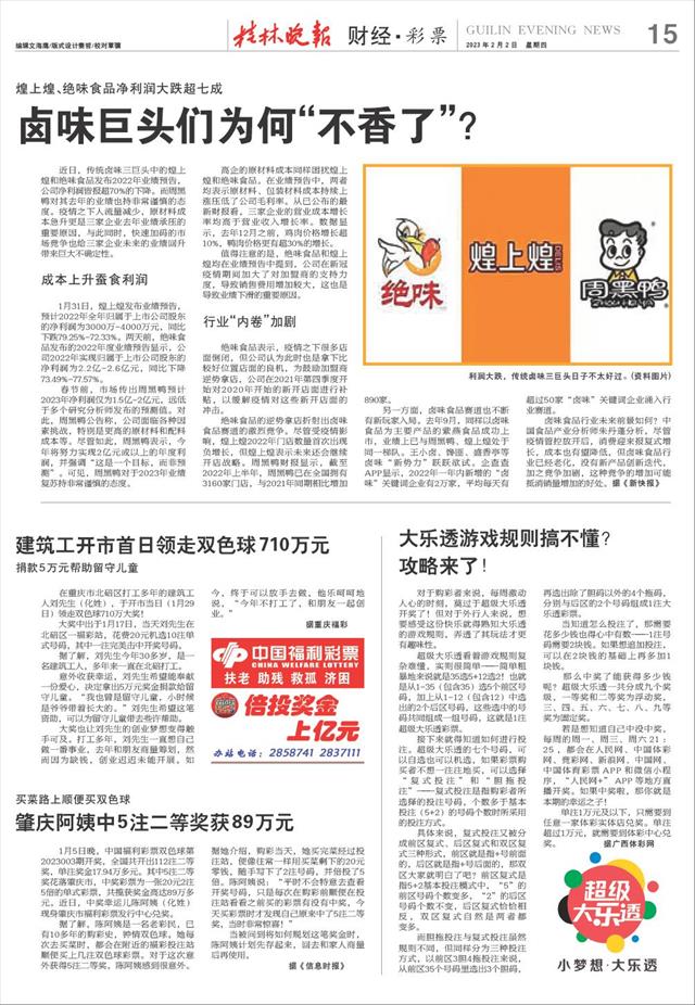 1月31日,煌上煌发布业绩预告,预计2022年全年归属于上市公司股东的净利润为3000万-4000万元,同比下跌79.25%-72.33%。两天前,绝味食品发布的2022年度业绩预告显示,公司2022年实现归属于上市公司股东的净利润为2.2亿-2.6亿元,同比下降73.49%-77.57%。