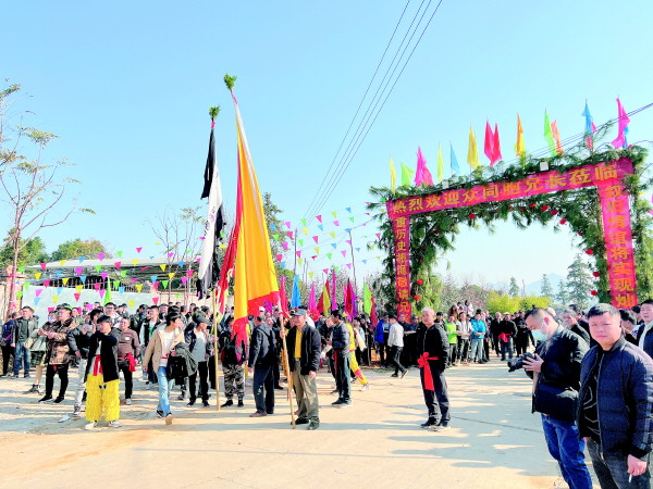 只见用松树枝搭建的迎客大门立在村口村道上,大门上的对联写着:“叙旧情谊将实现灿烂辉煌 重历史根源敬请兄长团聚”。迎客门下,人头攒动,彩旗飘飘,锣鼓声震天。