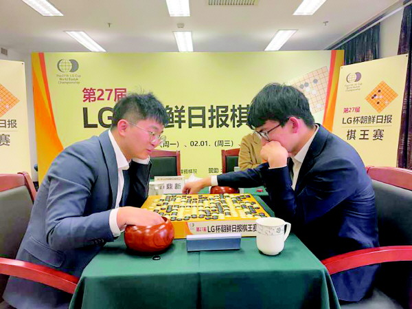 LG杯决赛第2局,丁浩(右)与杨鼎新在比赛。