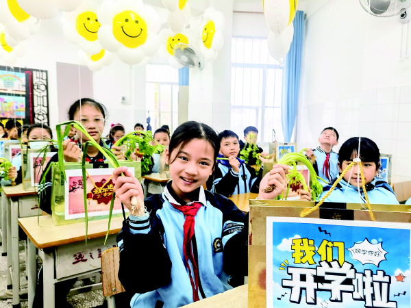 在解放路小学,老师除了提前用气球、迎新板画等精心布置班级氛围,还为同学们准备了特殊小礼物——小葱意为聪明,大蒜意为会算,香芹寓意勤奋。面对这仪式感满满的开学场面,同学们兴奋不已,欢呼“太有意思了”。