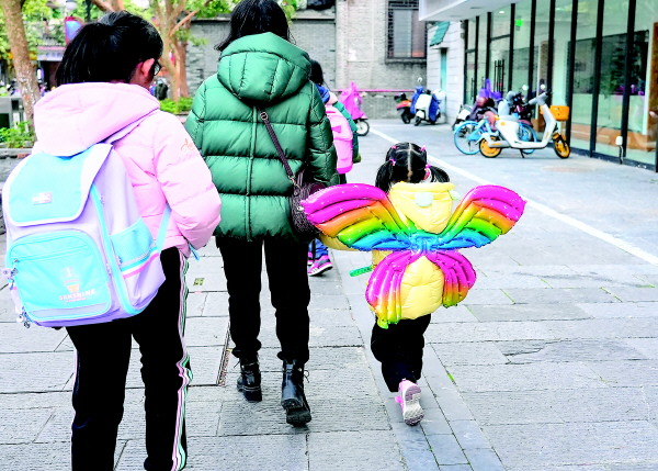 14日,在市区中华路,一名小女孩背着一个蝴蝶造型的气球翅膀走在路上,翅膀色彩鲜艳,吸引了旁边另一名女孩的目光。 记者李凯 摄