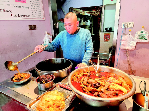 在通泉巷有一家螺蛳粉店,尽管开店时间不久,但老板凭借着一门传承了40年的手艺,获得了很多市民及游客的点赞。