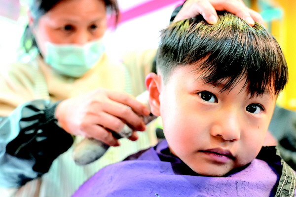 市内一家理发店,家长带着小朋友来“剃龙头”。