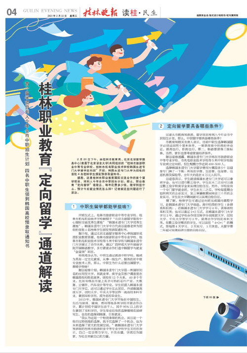 市教育局相关负责人表示,根据部署,我市以办好桂林大职教理念为出发点,根据桂林中职学校专业设置与韩国、加拿大高校专业的匹配度,在区直、市属、县级职校遴选学校进行项目试点。市属以旅职、机电、卫校三校为试点,区直和县职校分别以广西商业技师学院、荔浦市职教中心为试点,打通桂林中职学生到国外优质高职和本科院校升学和高薪就业的渠道。基础教育项目选择尚贤、国龙、奎光等为试点,推进普通高中国际化配套发展。以订单班形式将中韩、中加留学项目列入2023年全市中职招生计划。