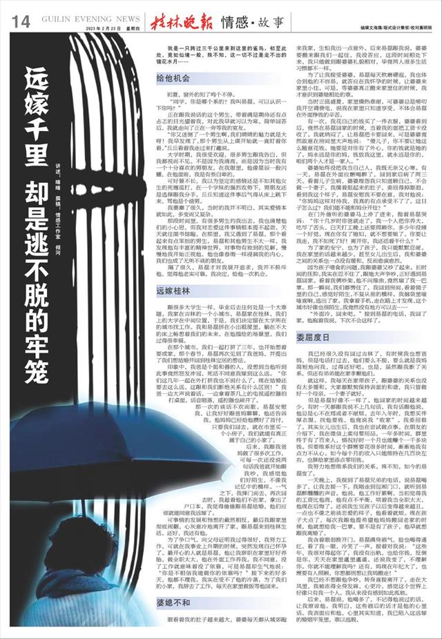后来,易磊说,他喝多了,不记得他说过的话,让我原谅他。我明白,这些酒后的话才是他的心里话。我表面应和他,心里其实知道,我已陷入这远嫁的婚姻牢笼里,难以逃脱。