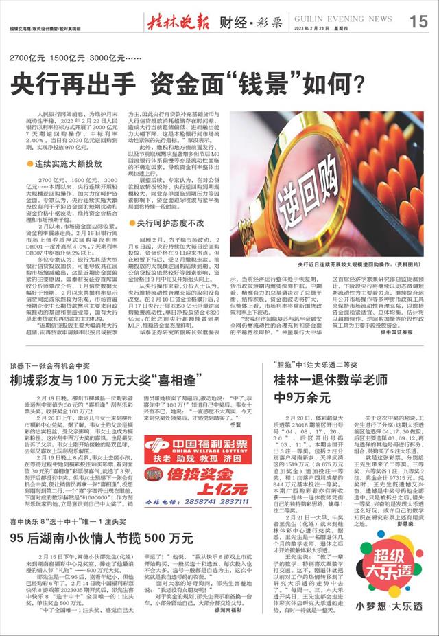 央行再出手 资金面“钱景”如何?   人民银行网站消息,为维护月末流动性平稳,2023年2月22日人民银行以利率招标方式开展了3000亿元7天期逆回购操作,中标利率2.00%。当日有2030亿元逆回购到期,实现净投放970亿元。