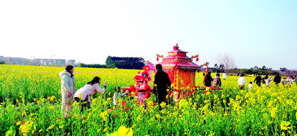 油菜花开,遍地金黄,游人三五成群走在田埂上尽情欣赏着金灿灿的花海,不时用手机、相机拍摄,定格这春天的美景。蜜蜂在花间飞舞采粉,忙得不亦乐乎。花海中放着一顶轿子,大人小孩纷纷把它当做道具拍照。这是2月26日下午记者在万福东路窑头村看到的场景。