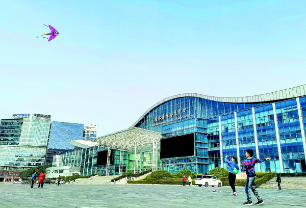 孩子们在甲天下广场放风筝。记者滕嘉 摄