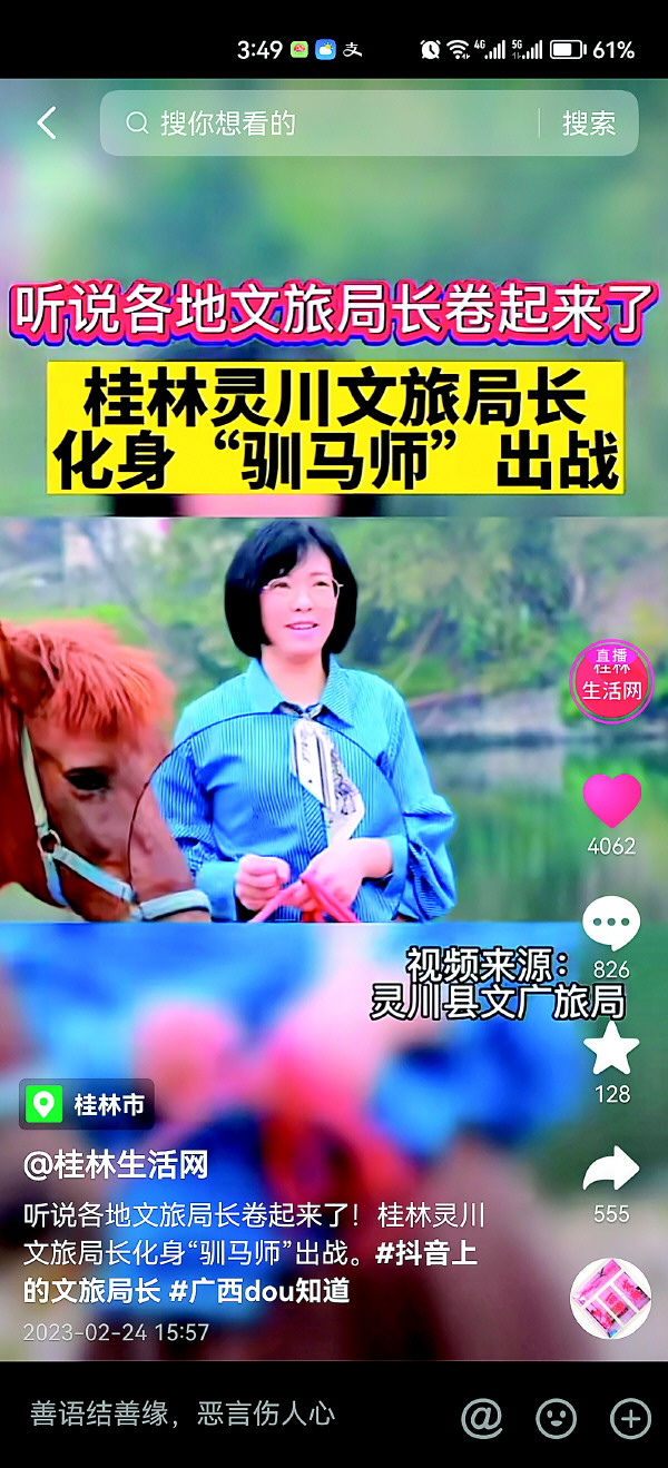 灵川县文化广电体育和旅游局微信公众号发布的《文艺局长“驯马记”》拍摄花絮,引发众多网友关注。这段花絮经过多方媒体转发,截至2月28日,浏览量已经破百万。众多网友在线“求更新”,还问“正片”到底什么时候出。很多本地网友评论说,无论是“正片”还是花絮,都是推动当地文旅发展的有益尝试。