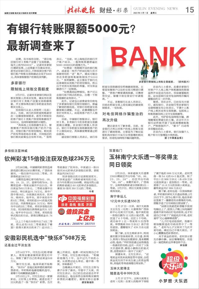 最新调查来了   近期,有市场传言称,“部分地区银行对Ⅰ类账户设置了交易限额,每天上线为5000元”。记者对多家银行调研发现,上述现象不仅确实存在,甚至还有银行表示,不排除部分客户的银行账户转账交易限额还会低于5000元,具体要根据客户的情况来判断。