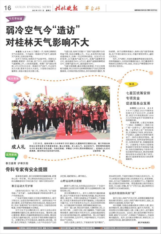 对桂林天气影响不大   本报讯(记者马翔)2月最后一天,桂林以晴朗的天气完美收官。今天起有一股弱冷空气南下,就桂林天气来说,总体比较平稳。