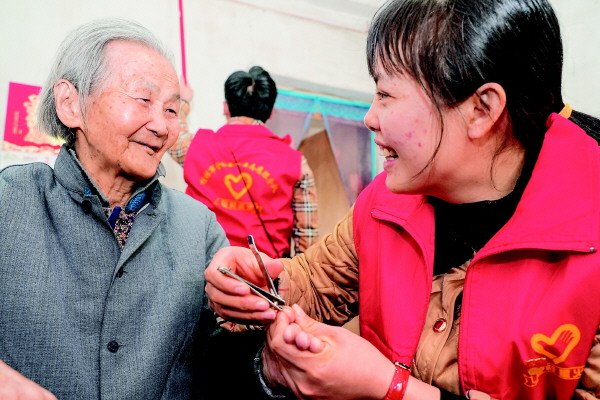 3月1日上午,志愿者来到秀峰区一社区的独居老人家中,为老人剪指甲和打扫卫生。 记者滕嘉 摄