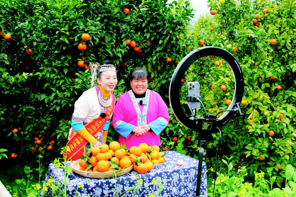 “观众朋友们,我们今天展示的沃柑都是从果树上新鲜采摘下来的,品质有保证……”2月24日,天上还在下着毛毛雨,一群志愿者来到龙胜各族自治县瓢里镇界泉村,在山坡上的果树林间开展直播活动。