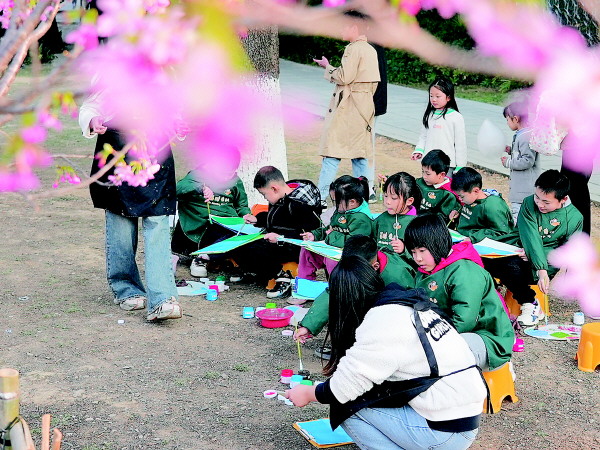 近日,在南溪山公园内,一群学生在老师的带领下在樱花树下写生。阳春三月,桂林处处都是好风景,孩子们沉浸自然,用他们的画笔描绘着春天的诗情画意。记者李凯 摄
