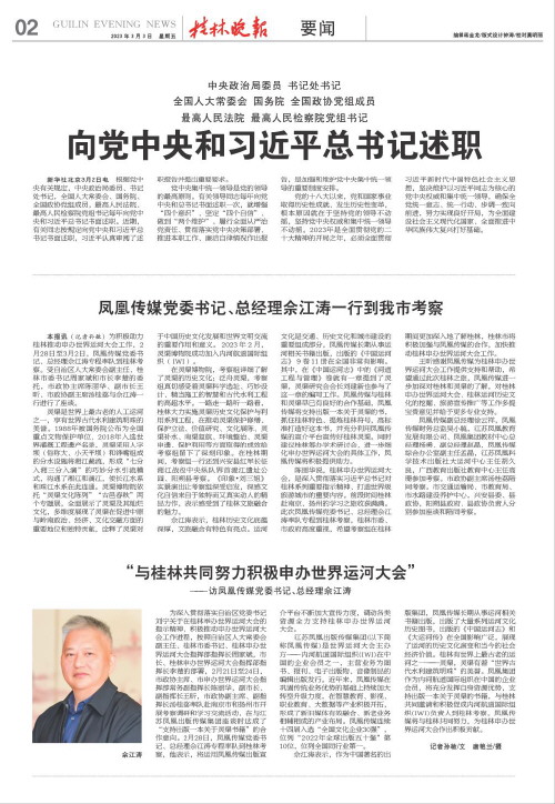 凤凰传媒党委书记、总经理佘江涛一行到我市考察   本报讯(记者孙敏)为积极助力桂林推动申办世界运河大会工作,2月28日至3月2日,凤凰传媒党委书记、总经理佘江涛专程率队到桂林考察。受自治区人大常委会副主任、桂林市委书记周家斌和市长李楚的委托,市政协主席陈丽华、副市长王昕、市政协副主席汤桂荔与佘江涛一行进行了座谈。