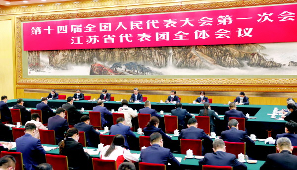 3月5日,中共中央总书记、国家主席、中央军委主席习近平参加他所在的十四届全国人大一次会议江苏代表团审议。新华社记者 黄敬文 摄