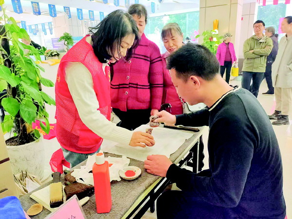 “你这幅山水画拓出来很好看啊。”“你在这个角落稍微用力,这样可以让花的形状更清晰。”桂海碑林博物馆带来的拓碑体验活动,对林聚强最有吸引力。桂海碑林博物馆党支部和其他几所单位一样,都是到铁路社区“双报到双服务”党组织,当天参与学雷锋活动的在职党员志愿者耐心细致地指导居民们拓碑。一幅幅山水、人物、花鸟画随着“哒哒哒”的拓碑声逐渐成形,看着亲手做出来的拓碑成品,居民们眼睛里都闪着激动的光芒。