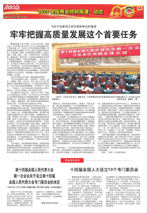 “高质量发展是全面建设社会主义现代化国家的首要任务。”习近平总书记5日下午参加十四届全国人大一次会议江苏代表团审议时的重要讲话,为全面贯彻落实党的二十大精神、以高质量发展扎实推进中国式现代化指明方向,在代表委员和广大干部群众中引起热烈反响。