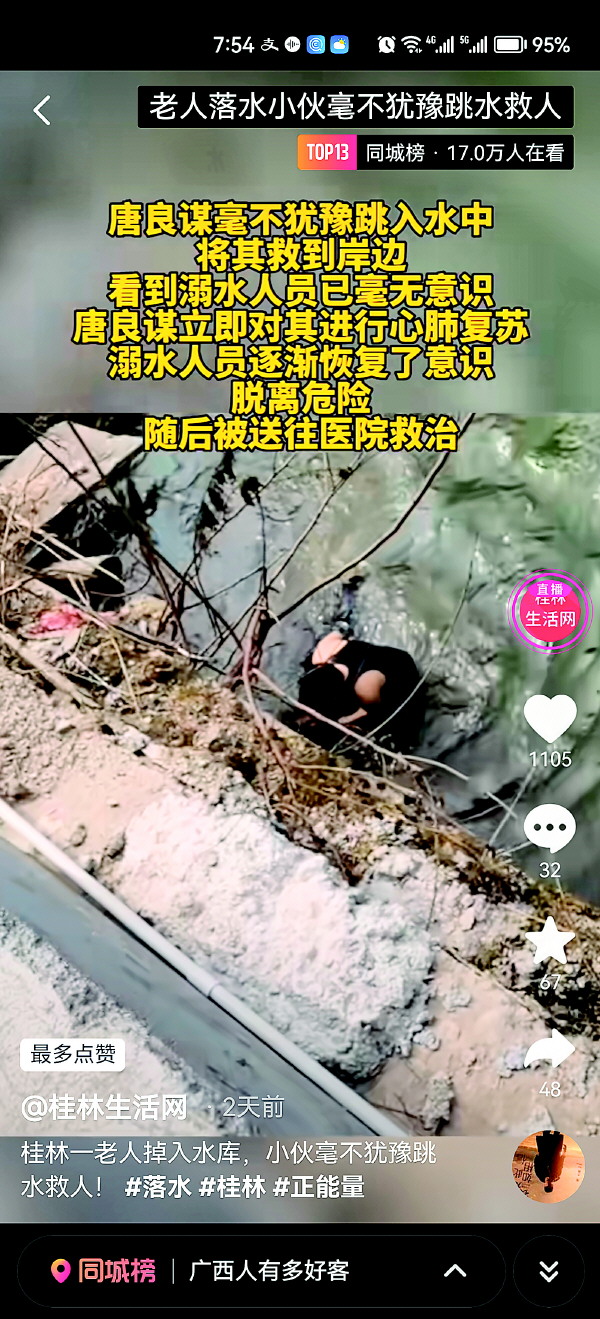 有在现场的人拍下了唐良谋和唐小明的救人过程,这段视频被发布在网络上,引起了广泛关注。