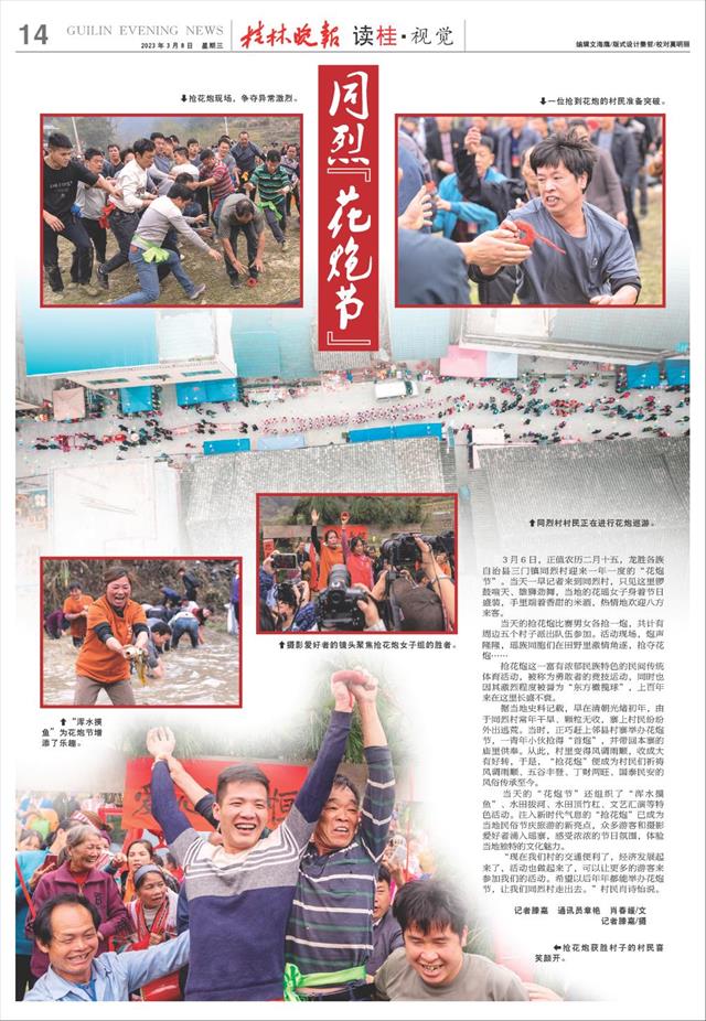 同烈“花炮节”   3月6日,正值农历二月十五,龙胜各族自治县三门镇同烈村迎来一年一度的“花炮节”。当天一早记者来到同烈村,只见这里锣鼓喧天、雄狮劲舞,当地的花瑶女子身着节日盛装,手里端着香甜的米酒,热情地欢迎八方来客。