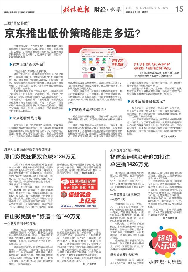 京东推出低价策略能走多远?   打开京东APP,“百亿补贴”“超值爆款”等字眼出现在了首页明显的位置。3月6日凌晨,京东上线“百亿补贴”,但未宣布活动下线时间。这意味着始于拼多多的“百亿补贴”,已经成了电商“三巨头”的常规营销手段。