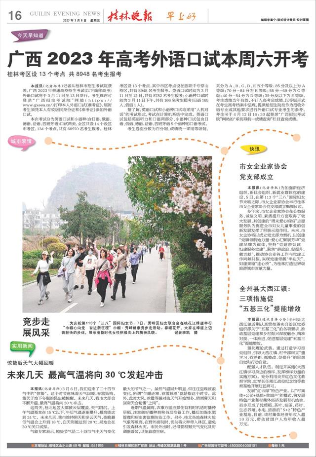 广西2023年高考外语口试本周六开考 桂林考区设13个考点 共8948名考生报考   本报讯(记者邱浩)记者从桂林市招生考试院获悉,广西2023年普通高校招生考试(以下简称高考)外语口试将于3月11日至13日举行。考生现在可登录“广西招生考试院”网站(https://www.gxeea.cn/)打印本人外语口试《准考证》,届时考生须凭本人有效居民身份证和《准考证》参加外语口试。