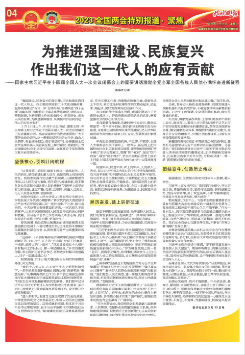 3月13日上午,中共中央总书记、国家主席、中央军委主席习近平在十四届全国人大一次会议闭幕会上发表重要讲话。出席全国两会的代表委员和广大干部群众纷纷表示,这一重要讲话坚定历史自信、饱含人民情怀、彰显使命担当、指引前进方向,必将激励全党全军全国各族人民在新征程上踔厉奋发、勇毅前行,为全面建设社会主义现代化国家、全面推进中华民族伟大复兴而团结奋斗。